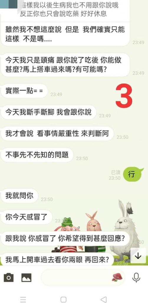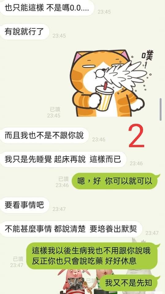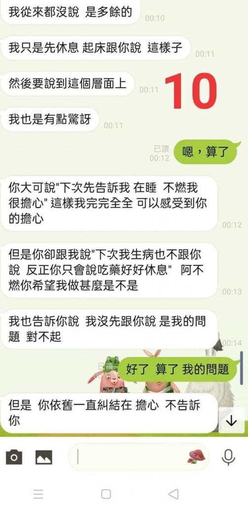 「雖然大部分人都覺得女生問題較大,但感覺男生少個步驟,有了這步驟應該會少很多事情….就說個對不起,不是故意的,是因為身體真的不舒服,下次如果真的又發生的話,會先說明再休息(完),最好再多哄一下更加沒事…..感想:男的木頭,女的較不獨立」