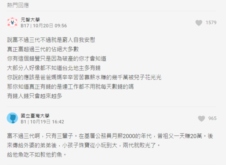 不過,有網友認為真正有錢的其實富好幾代,「說富不過三代不過就是窮人自我安慰,真正富超過三代的佔絕大多數」、「揮霍不努力的有錢人有的確實富不過三代,但多得是比你有錢還比你努力的人」、「真的很富的還是有很多低調到不行,整個很一般人的」、「其實很多有錢家庭破產正是因為後代太有上進心,聽過不少富二代創業弄出個錢坑把家裡搞破產的,反倒是那些在手游上大把大把克金的廢富二代都過得好好的,通常拉富二代會倒,都是沒能力+太有上進心」。