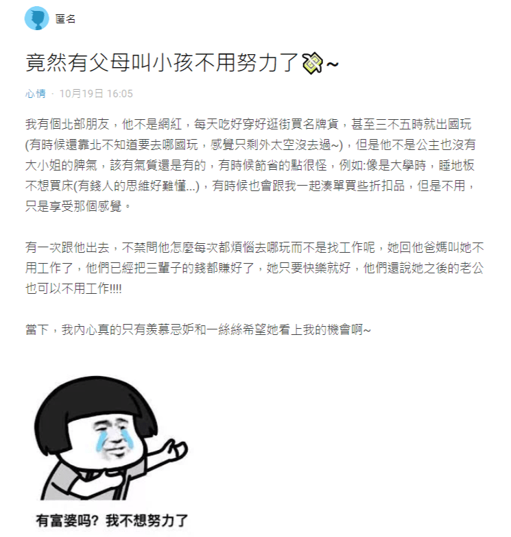 許多人夢想成為「有錢人」,希望可以過著無憂無慮的生活。一名網友他有位女性朋友,父母竟叫她「不用努力了」,他們都把錢賺好了,只要她快樂就好,這讓原po相當羨慕,引起許多網友熱烈討論。