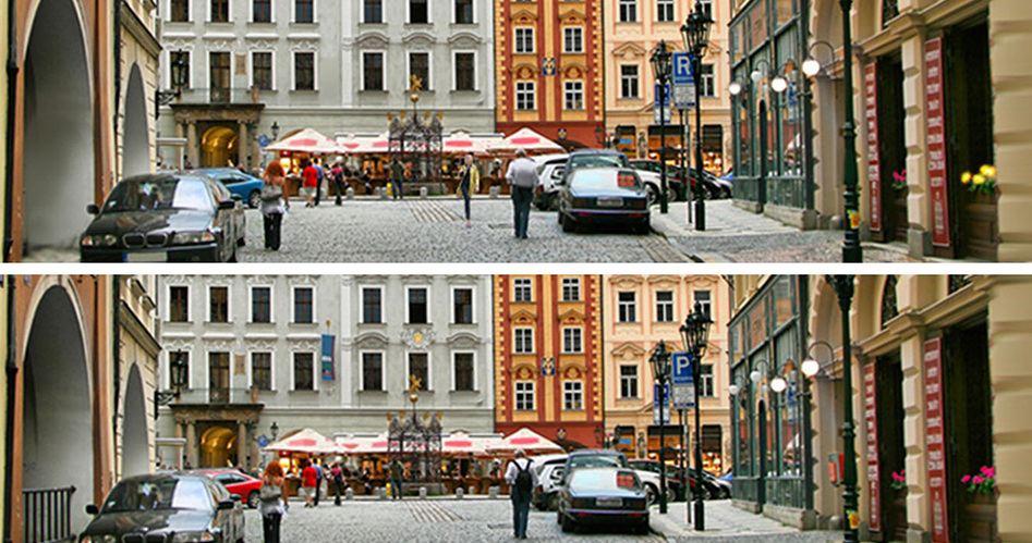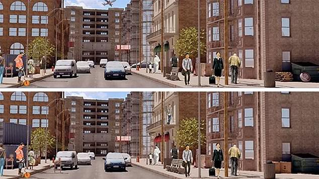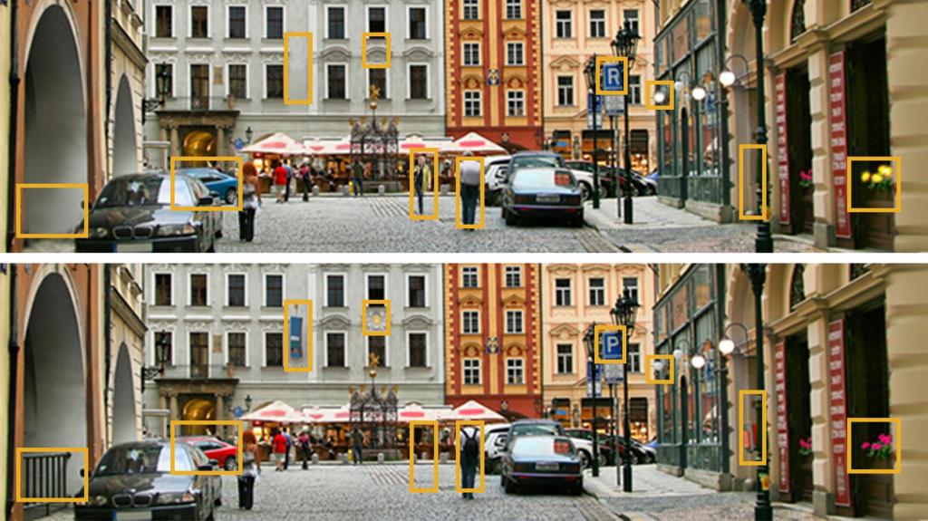 行人、安全欄杆、汽車顏色等差異都比較明顯,很快就被找了出來。