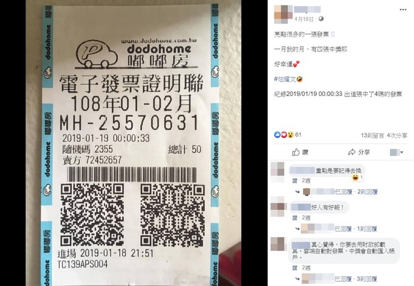 凃女在4月18號時發現自己1月份發票中了五獎,