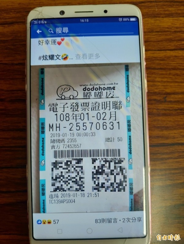 她興奮的拍下發票PO在臉書上炫耀,