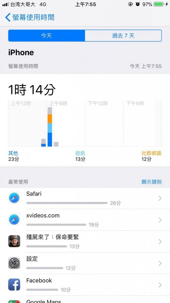 其中最受大家注目的就是這個「螢幕使用時間」!這是用來防止手機沉迷,可以看到一天、一週的使用報表~