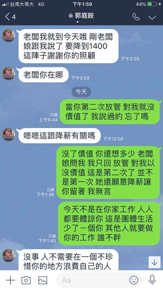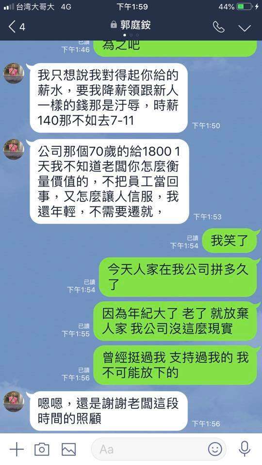 該員工傳訊息表示「老闆我就(工作)到今天喔」,原因是老闆娘將原本1700元日薪降到1400,使他忿忿不平,甚至還質問為何公司讓70歲老員工拿1800元日薪,更自負的表示「人不需要在一個不珍惜你的地方浪費自己的人生」。