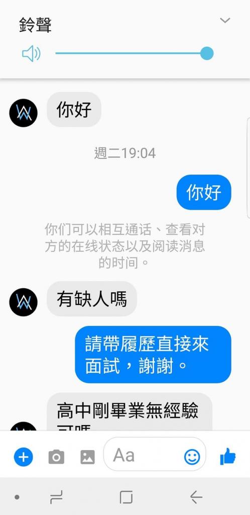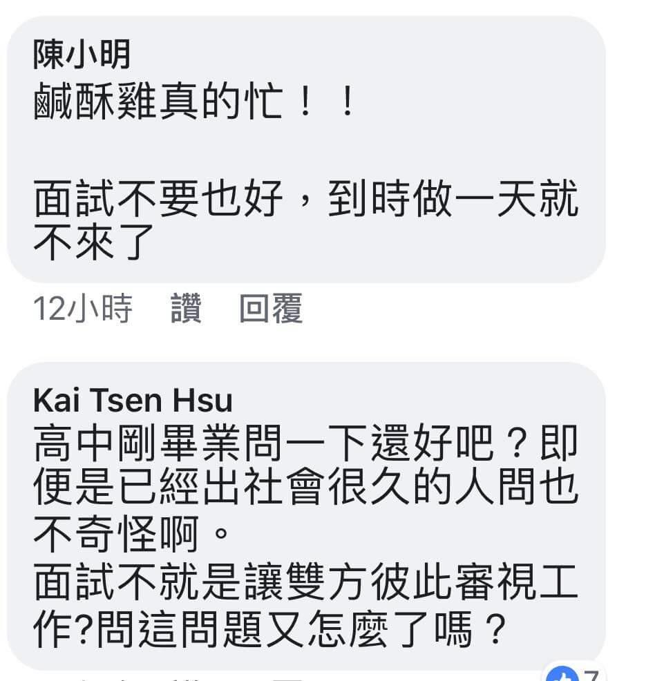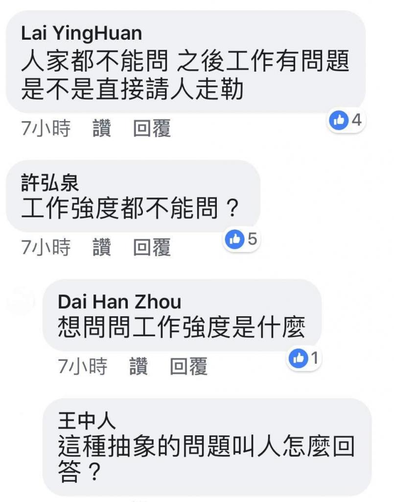 「為也是覺得他問一下而已並無不妥,他不是問(薪水多少、幾天假、有沒有三節獎金)什麼都還沒做到就在問福利的就叫他慢走,不需要這麼極端的回答或許他剛傳社會怕太難的他無法勝任至少他有先請教避免造成你的困擾。不要當慣老闆也不要請到無責任感的員工。 」
