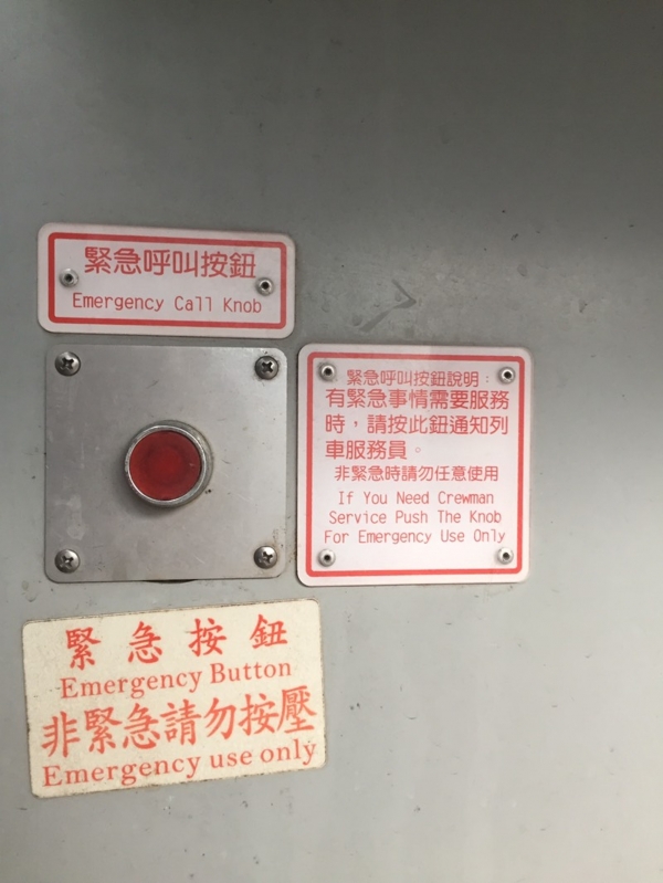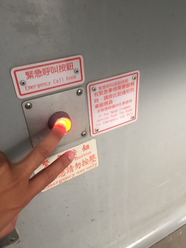 下一秒,他看到了顯眼的「緊 急 呼 叫 按鈕」,一心以為按了應該只有列車長才會知道,然後是列車服務員來瞭解狀況…沒想到,一陣旋律聲就這樣響起來