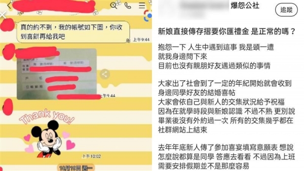 沒想到,新娘卻特別的「熱情」!知道他沒辦法前往參加婚禮之後,還堅持要把喜餅寄過去給他,並直接附上自己的存摺照片,毫不避迴的告訴原PO收到喜餅之後就要將禮金匯給她,第一次面對這樣的事情,讓她不知道該怎辦?