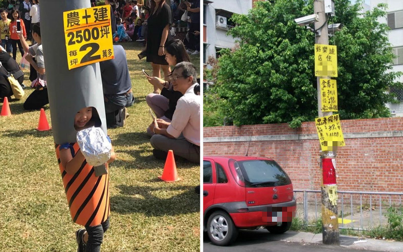 而從照片中可以看到,小男孩身上裹著一圈長長的灰色紙筒,上面挖出了3個洞,分別露出臉和雙手,接著底下則是橘色搭配黑色線條的樣式,看起來根本就和路邊的電線桿毫無區別。不過更狂的是,小男孩的爸媽竟然還細心到在紙筒最上方,貼了一張黃色的紙,寫著「農+建2500坪,每坪2萬多」,原來是在仿造電線桿上常見的廣告傳單,如此畫龍點睛之舉,也讓相似度瞬間逼近100%。