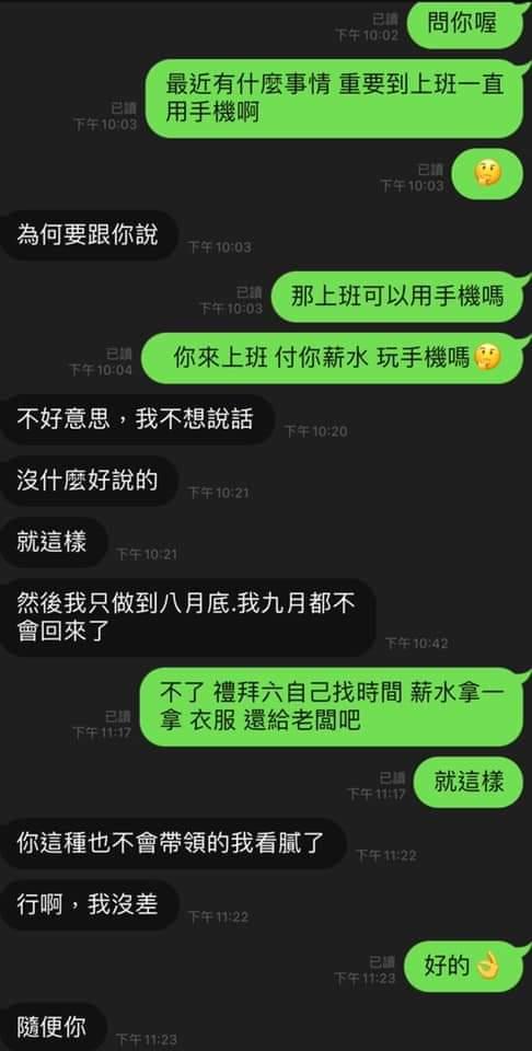 「年輕人很多都這樣。工作隨便做 ,說不來就不來。直接人間蒸發,然後在傳訊息要領錢!凸」