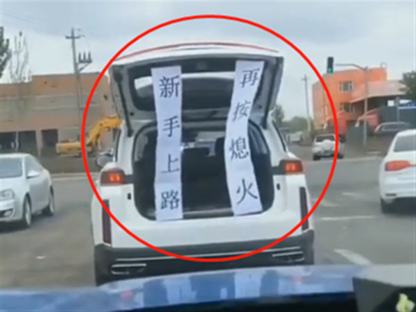 沒想到,白車駕駛聽到喇叭聲後,非但沒有加快速度,反而打開了後車箱,而在完全展開之後發現裡面有副對聯,上聯寫著「新手上路」,下聯則是「再按熄火」,相當挑釁,讓他相當氣憤。不過氣憤之餘,後方駕駛也只能夠摸摸鼻子,明白對方的意思,最後默默地繞道離開。
