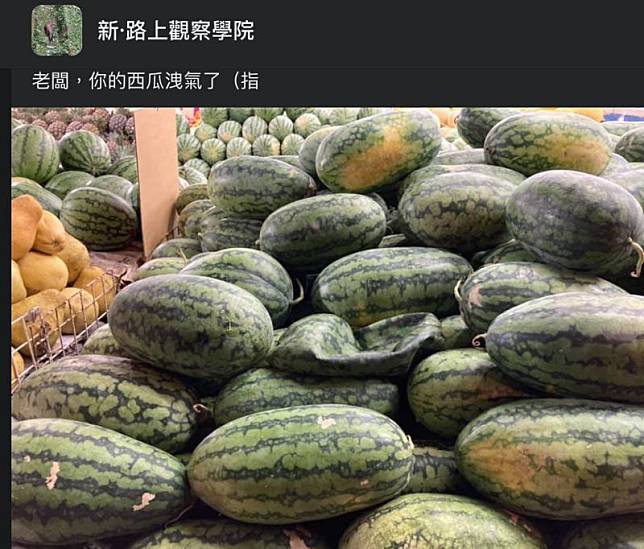 有位網友在臉書社團《新·路上觀察學院》發文,分享了一張水果攤拍攝的照片,笑稱「老闆,你的西瓜洩氣了」。而從照片中可以看見,攤位上成堆的大西瓜之中,有一顆「消風漏氣」的扁掉西瓜特別與眾不同,像是一顆洩了氣的籃球似的只剩軟趴趴表皮,放在其他大西瓜之中顯得十分突兀。