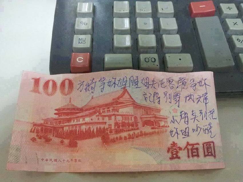 活在這個什麼事情都會發生,什麼事情都不奇怪的社會裡頭,現在太多不合理的事情都早已見怪不怪了,日前一名網友在臉書社團「爆廢公社」中分享了一張照片,照片裡頭是一張百元鈔票,而鈔票上面寫著一些字,原本也表示:「這鈔票…道出了一段不尋常的姦情。」