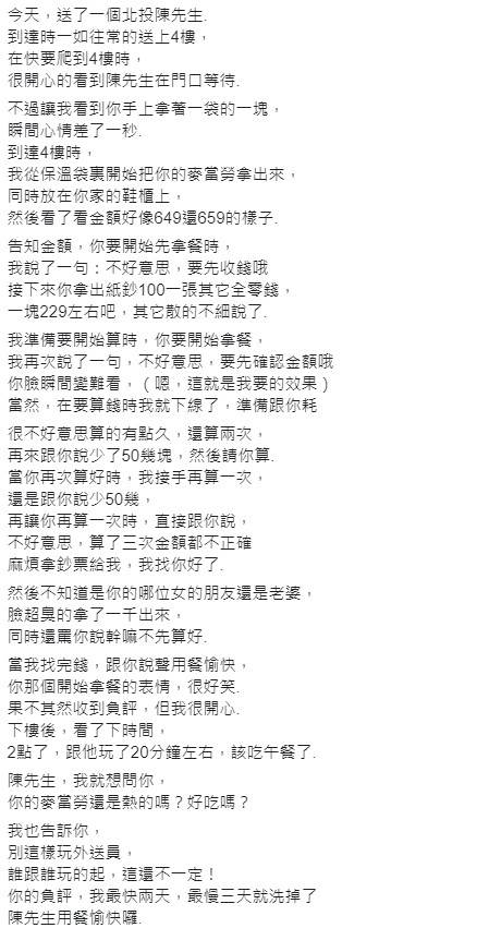 原本這位「北投陳先生」看到外送員抵達家門口時,便迫不及待想從外送援手中接過美食。不過不是吃素的原Po,一開始也先照公司的流程告知對方必須「先確認餐點金額」才可以用餐。但北投的陳先生似乎餓過頭沒有聽清楚原Po說的話,因此第一時間便準備將手中的硬幣丟給外送員數,並作勢取拿原Po手中的美食就準備轉身離開!