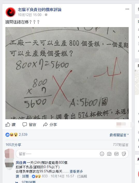「我猜又是很腦的建構式數學,你要寫7×800 =5600 這樣才正確,教材會很認真跟你講,你要用一個星期有七天,然後這七天去乘上800個蛋糕,所以是7×800=5600。」