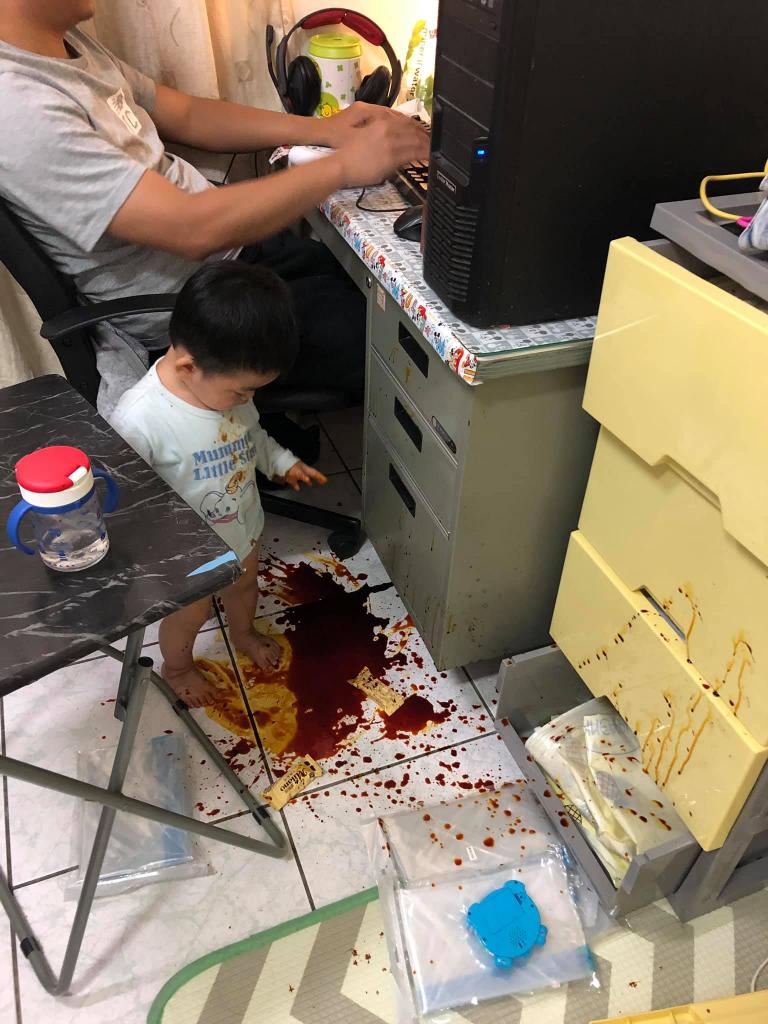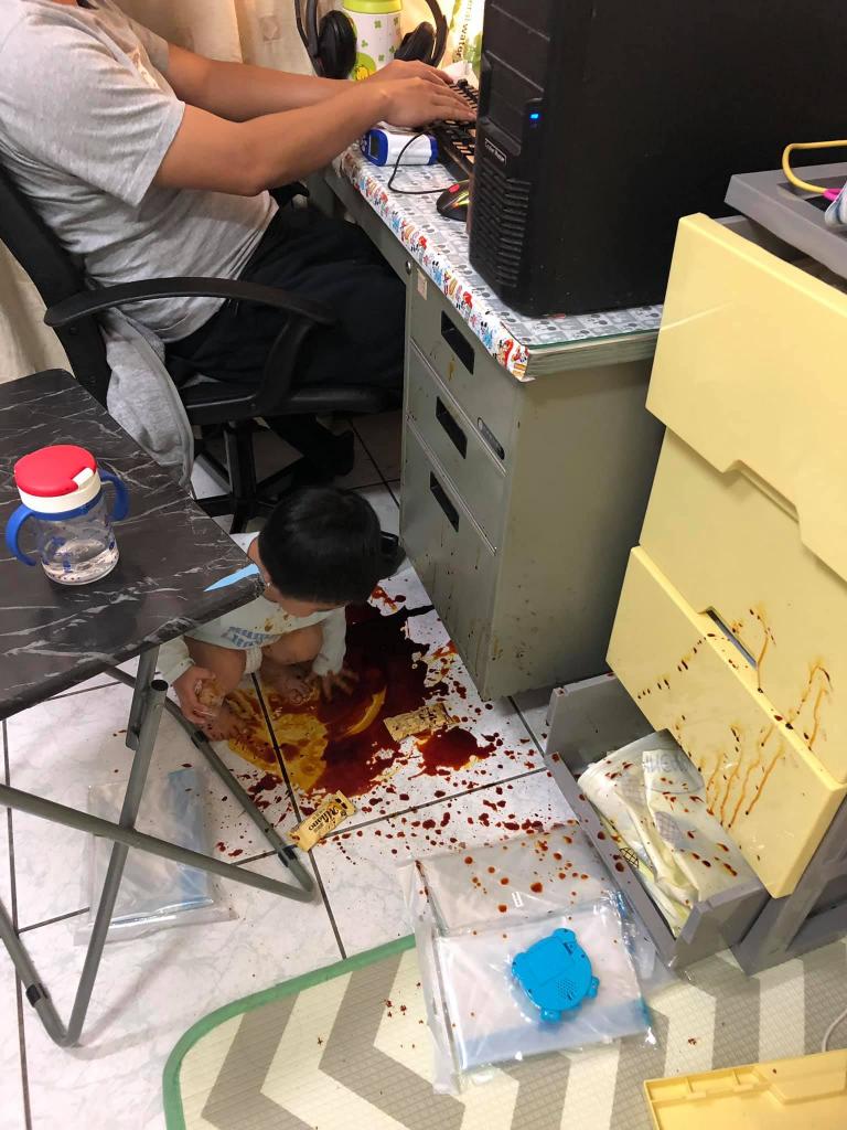 只見兒子蹲在一攤紅褐色液體中用手到處抹弄,一大塊磁磚和四周抽屜、椅子都被弄得滿是污漬,現場看起來一片狼藉,但誇張的是老公就坐在事發現場旁淡定打魔獸副本,一點都沒有想要處理的意思!