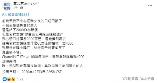 原PO在臉書粉專「靠北女友my girl」上發文表示,他日前不慎弄斷女友的口紅,為了展現負責任的一面,二話不說掏出2000元給對方當賠罪。然而,女友竟氣呼呼的說,「你當我乞丐?賠我這點錢」,被弄斷的口紅是「CL女王的權杖」,一支要價4000元!