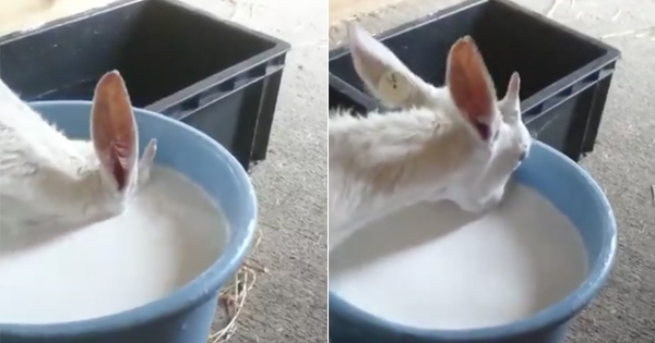 小羊把整顆頭都塞進裝滿羊奶的桶裡,連眼睛都泡在裡面,因為太急著喝奶,把呼吸都拋在腦後了。