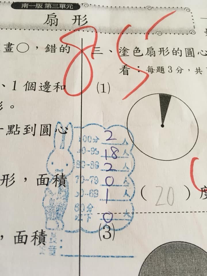 日前一名家長就在臉書社團PO文分享自己的經歷,原來某天孩子回家時遞給她一張考了85分的數學考卷,媽媽本來開心的覺得考得不錯啊! 但後來卻看到了老師在左下角蓋了一個「藍色兔兔章」,讓她瞬間心情盪到穀底:「小學生心很累,媽媽覺得已經很棒了,是那種明明進步卻怎麼還是排後面的心情。」