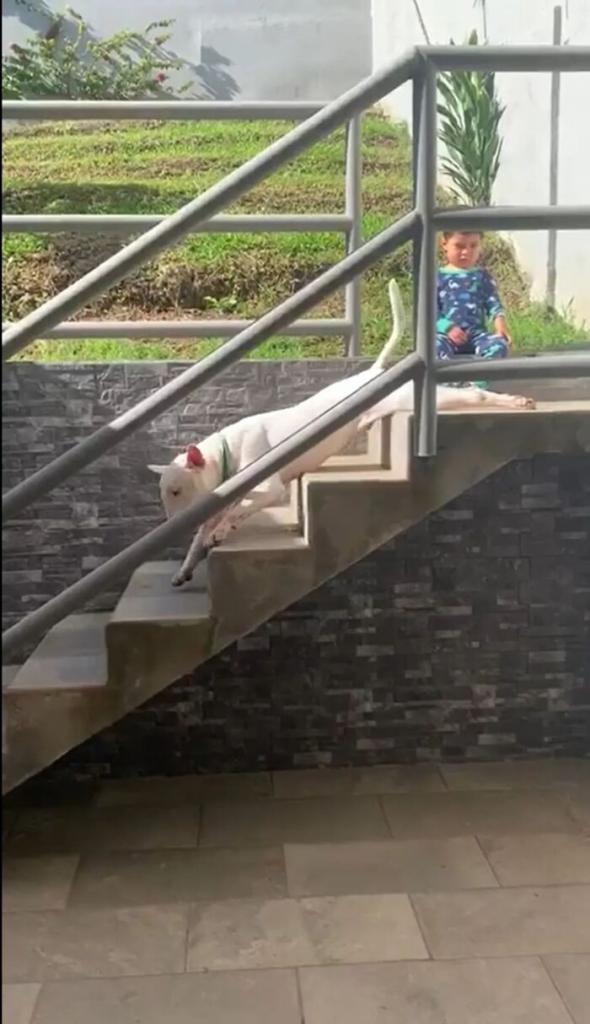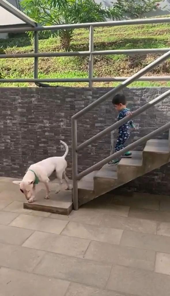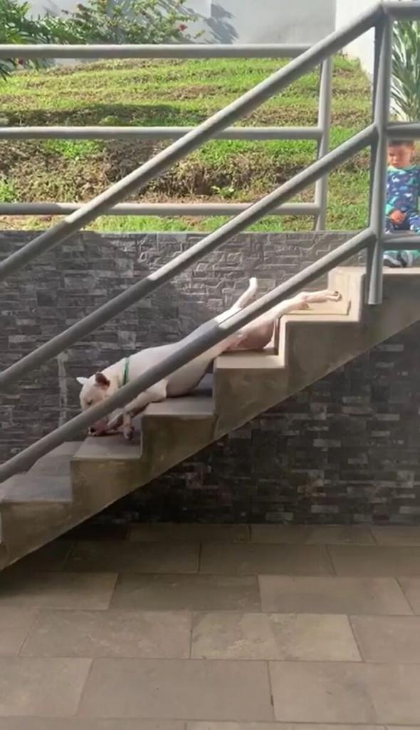 不過,Bruno下樓梯的方式有些「獨特」: