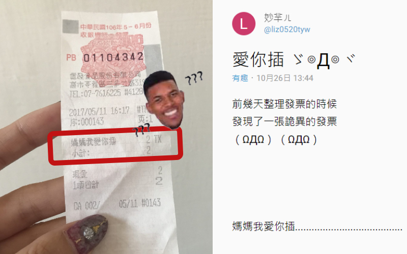 有女網友在Dcard上PO文,表示前幾天整理發票的時候,發現了一張詭異的發票,上面印著幾個字「媽媽我愛你插」。