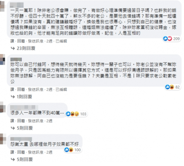 該名女網友透露,她提議住月子中心,並沒有挑最貴的一天2萬的房型