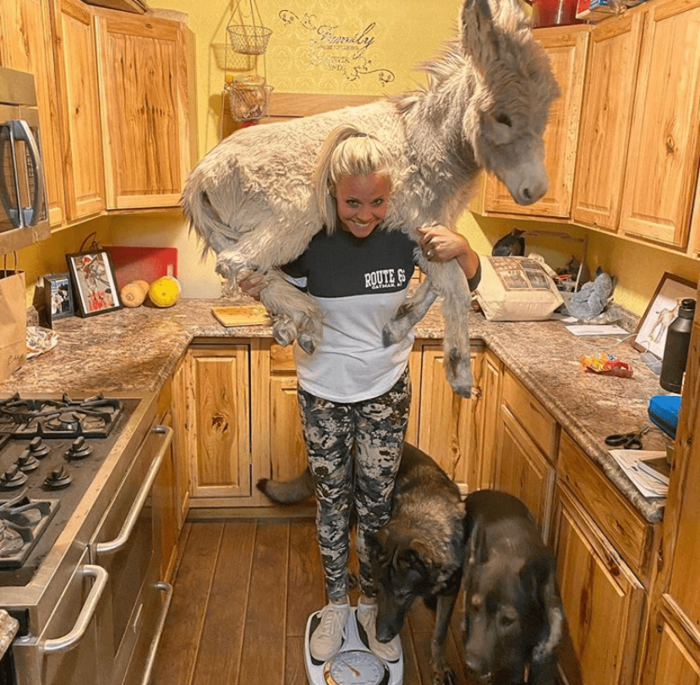 雖然凱莉沒有什麼照顧幼崽的經驗,她家的兩隻德牧倒是對這個新來的小傢伙很感興趣…… 從Walter來到家裡的第一天起,狗狗們就變成了牠的「奶爸」,每天還會輪流換班照顧牠……一頭驢被兩隻大狗狗養大的後果就是,生活習性完全跟狗狗沒有什麼兩樣。