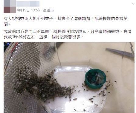網友透露「將捕蚊燈放在門口的車庫,僅睡覺時間點亮這個補蚊燈,高度放在大約165公分,1個月後情況就改善許多」,其中就是在捕蚊燈內多放了一瓶蓋的乳液「雪芙蘭」!許多網友看了照片紛紛留言表示:「真的很有效」、「蚊子真的抵抗不了雪芙蘭」、「好驚人的收穫」、「說真的捕蚊燈效果真的沒有很好!」