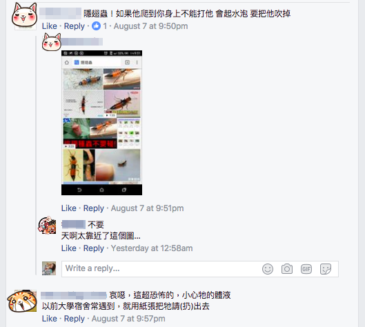 ▼沒想到朋友們看到卻都非常緊張!因為這可是會使皮膚潰爛的「隱翅蟲」啊!