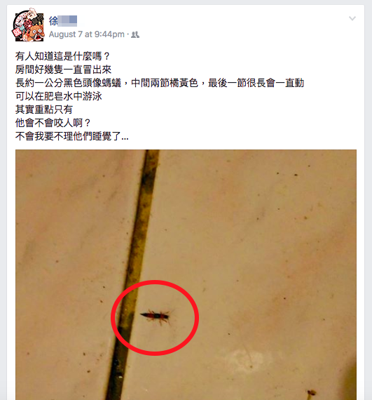 炎炎夏日,正是蚊蟲最活躍的時候,有些不知名的小蟲雖然看起來不起眼,對人卻可能帶來意想不到的危害!一名徐姓女網友在臉書上發文,表示自己目前住在公司宿舍,颱風過後房間冒出好幾隻不知名的小蟲,頭部長得像螞蟻,中間兩節是橘黃色的,最後一節很長還會一直動;那時已經是晚上了,她好奇在臉書發文問這是什麼蟲,如果不會咬人就要不理牠去睡覺了。