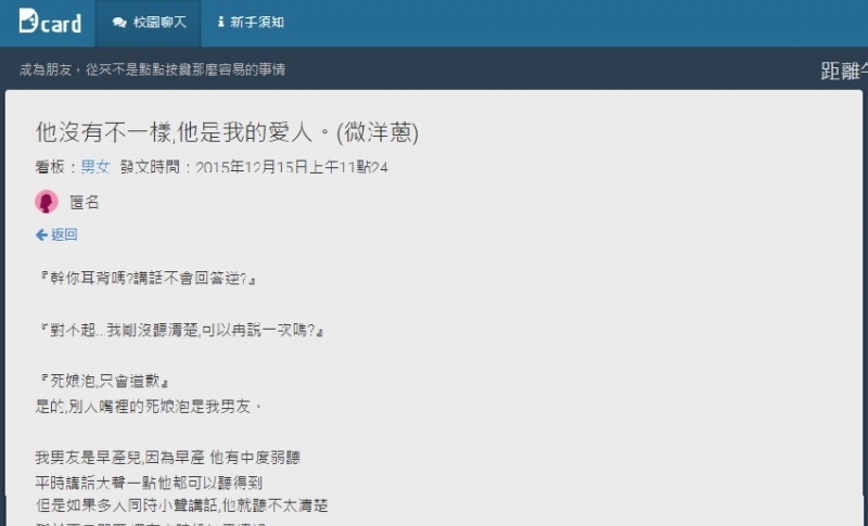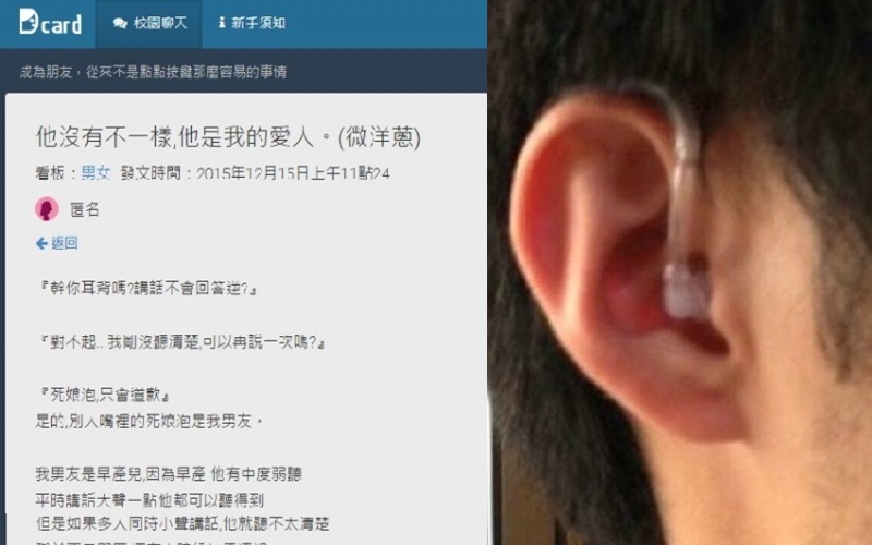 也因為沒有戴助聽器,有時候會漏聽到別人跟他說的話,加上我男友長得比較清秀,常常被同輩的誤會耍大牌、不理人、娘 泡等..