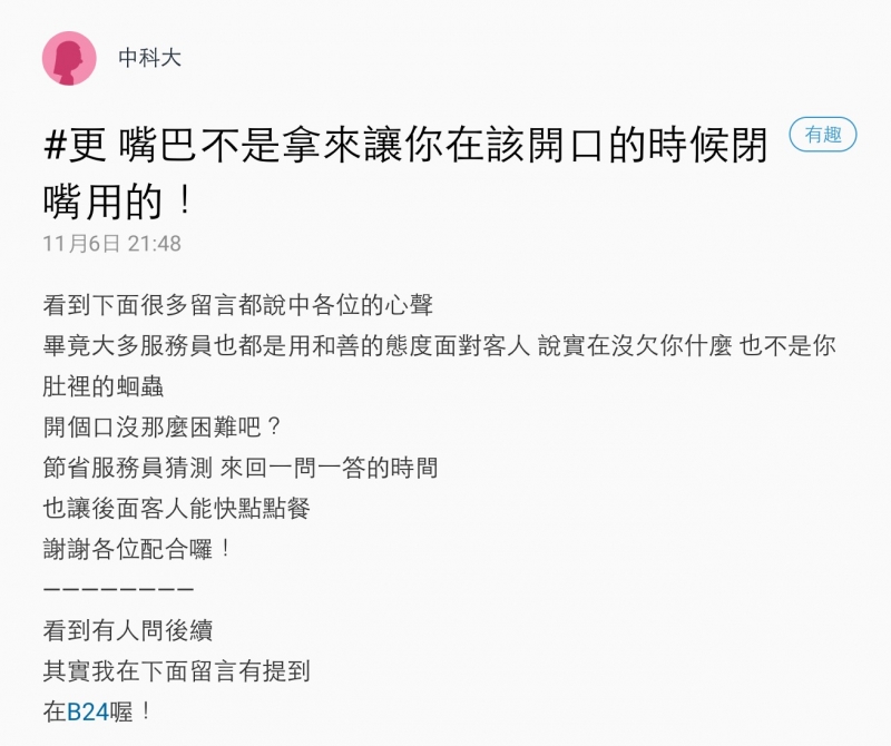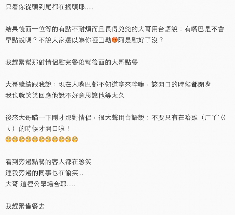 原PO便趕緊幫那對情侶點餐後緊接著幫大哥點餐,大哥繼續回應說:「現在人嘴巴都不知道拿來干嘛,該開口的時候都閉嘴」
