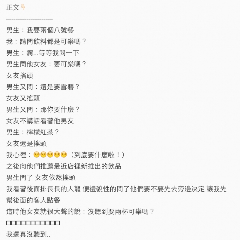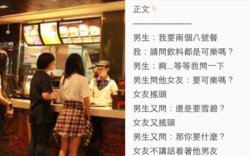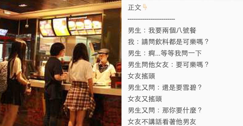 網友在DcardPO文,在速食店打工時一對情侶來點餐,過程中男友問女友要不要喝飲料女友一直搖頭,之後網友推薦店裡的新飲品,女生依舊搖著頭,原PO看到後面排隊的人龍便禮貌性問他們要不要去旁邊決定,先讓後面的客人點餐。