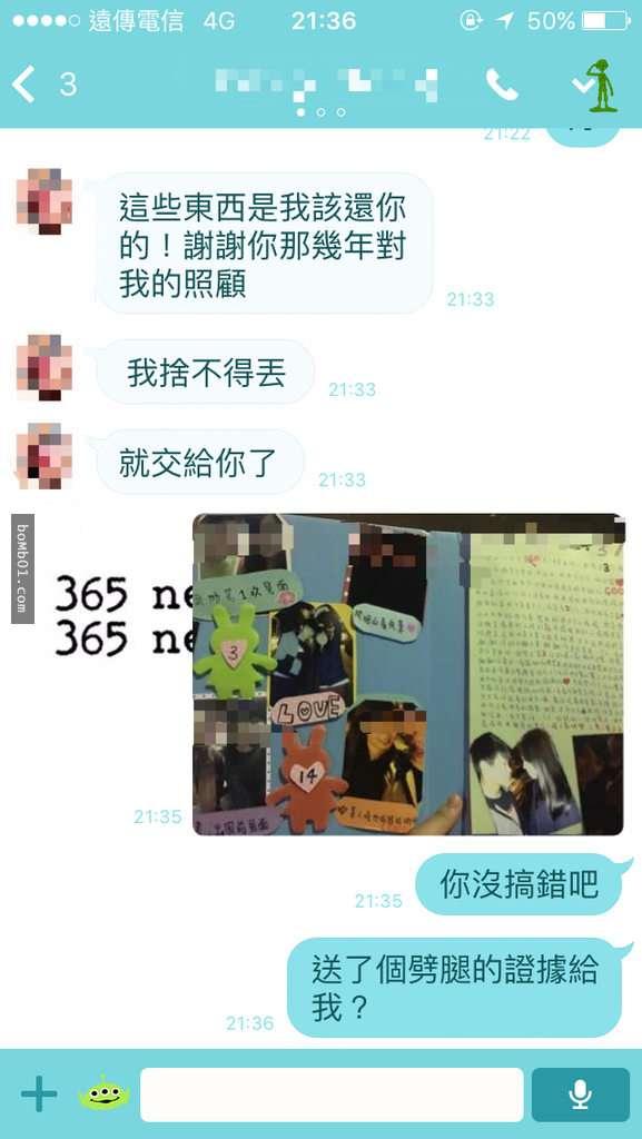 女網友上傳與前男友的對話,男友在訊息中表示有東西想要還給她。