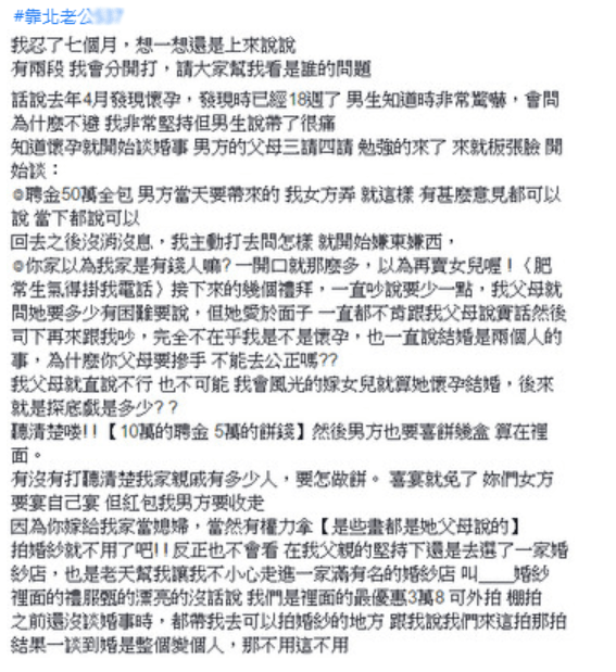 有網友在臉書社團上抱怨,去年4月發現自己懷孕了,沒想到在和男友談論婚事時,對方竟提出9項條件!