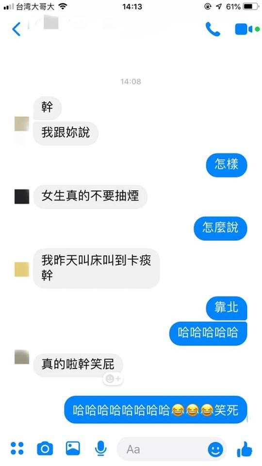 都說抽菸不好,除了對身體健康不好,更會對「男性雄風」大有耗損 但你知道其實不只男性,連女生都會深受其害!就有正妹現身說法,淚勸友人「真的不要抽!」 一名網友在臉書社團分享對話截圖,她勸友人不要抽菸,因為她「昨晚叫○叫到卡痰」 友人狂笑不已,令原PO惱羞成怒,「真的啦!笑屁」。 沒想到有相同經驗的人還不少,紛紛留言附和 「真的很尷尬!男友會給白眼」 「緊要關頭突然卡痰,超殺情調」 「我過來人,我都到一半的時候,先把喉嚨清一清」 確定卡的是痰?(大誤) (1862)