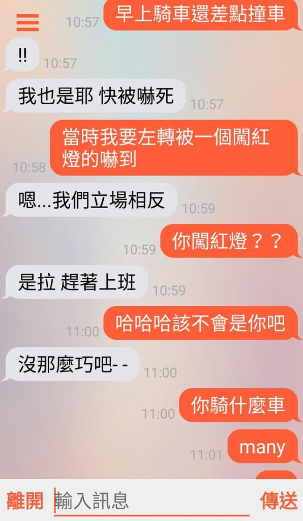 這是原PO網友則說,「當時我要左轉被一個闖紅燈的嚇到」,沒想到對方說:「嗯!我們立場相反」。這時原PO驚訝的問道:「你闖 紅燈?該不會是你吧!你騎甚麼車?MANY?」