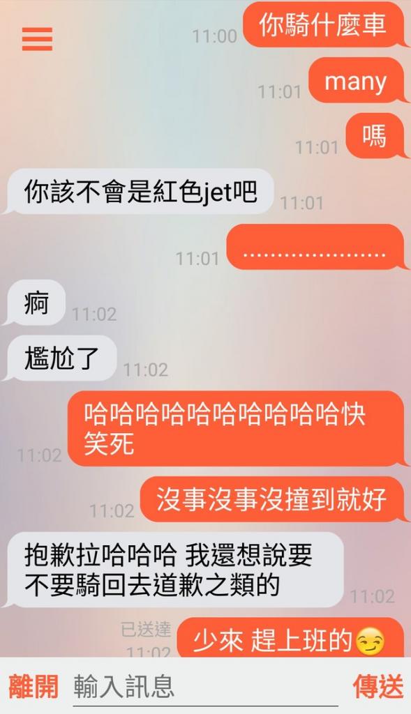 沒想到對方也竟回「沒這麼巧吧!你該不會是紅色Jet吧?」、「啊!尷尬了!」這時原PO也打了圓場表示「哈哈哈快笑死,沒事沒事沒撞到就好」。對方也表示誠心認錯,「抱歉啦哈哈哈!我還想說要不要騎回去道歉之類的!」
