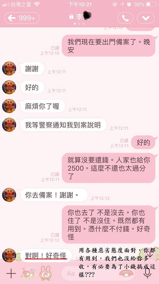最後到了半夜才姍姍回訊息,一副什麼事情都沒有發生過出國也沒有,來面對我的質詢,一直要我們賠償你…是要賠償什麼啦?爽的時候都沒有多給錢,