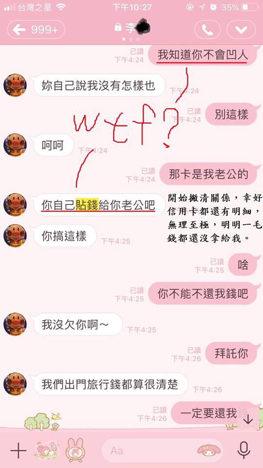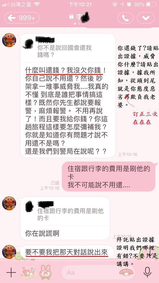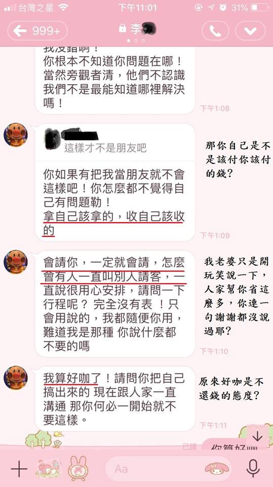 以下付上對話截圖,出國旅行難免有爭執,我也不敢說我或我老婆都對,一定有處理不好的地方,但是敢這麼欠錢真的很囂張,