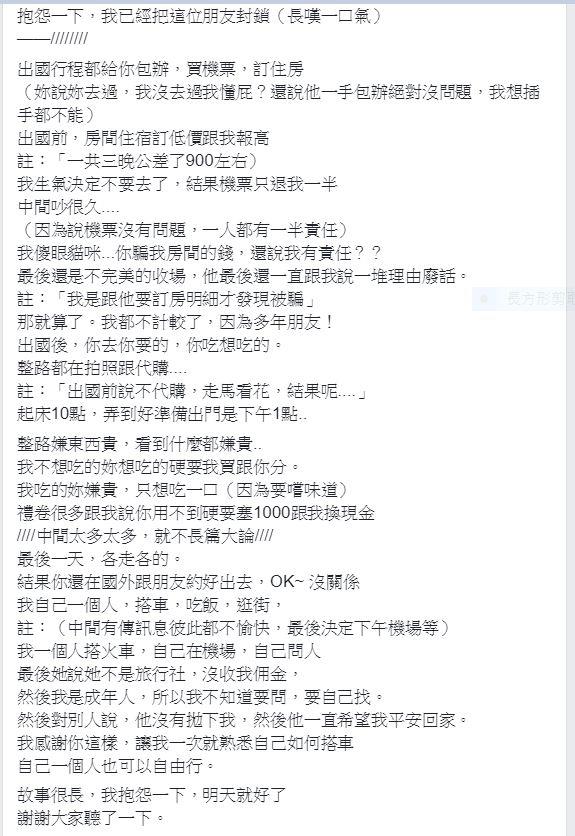 然後回國到處放話我老婆放生你,你奶奶的,做人憑良心好嗎?兩個小女生出國有不愉快的地方我都可以接受,因為難免,但是你是全程不愉快的嗎?