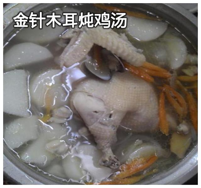 3. 用小火煮20分鐘後,再放入白木耳,金針,山藥,米酒,煮滾後,加蓋熄火燜20分鐘。