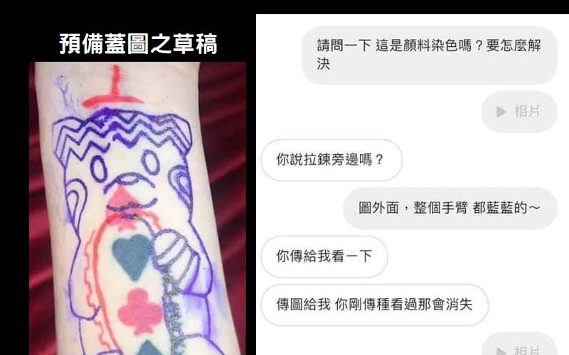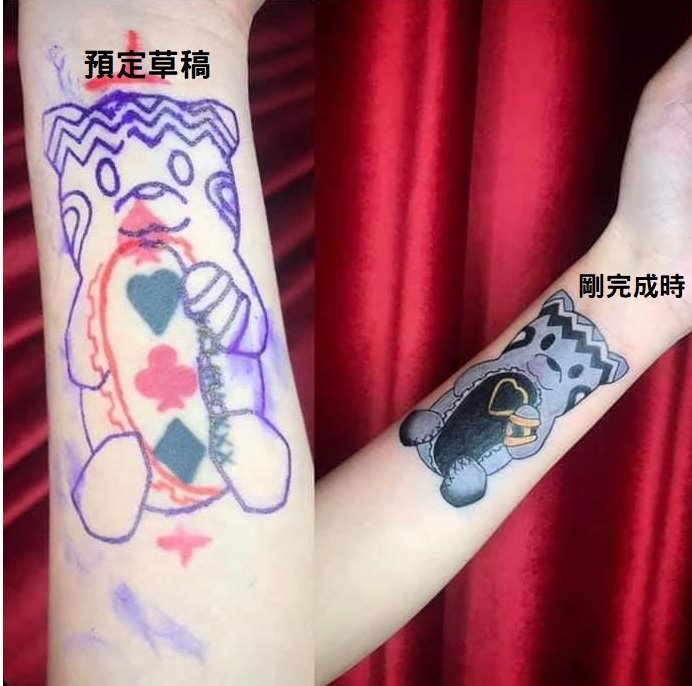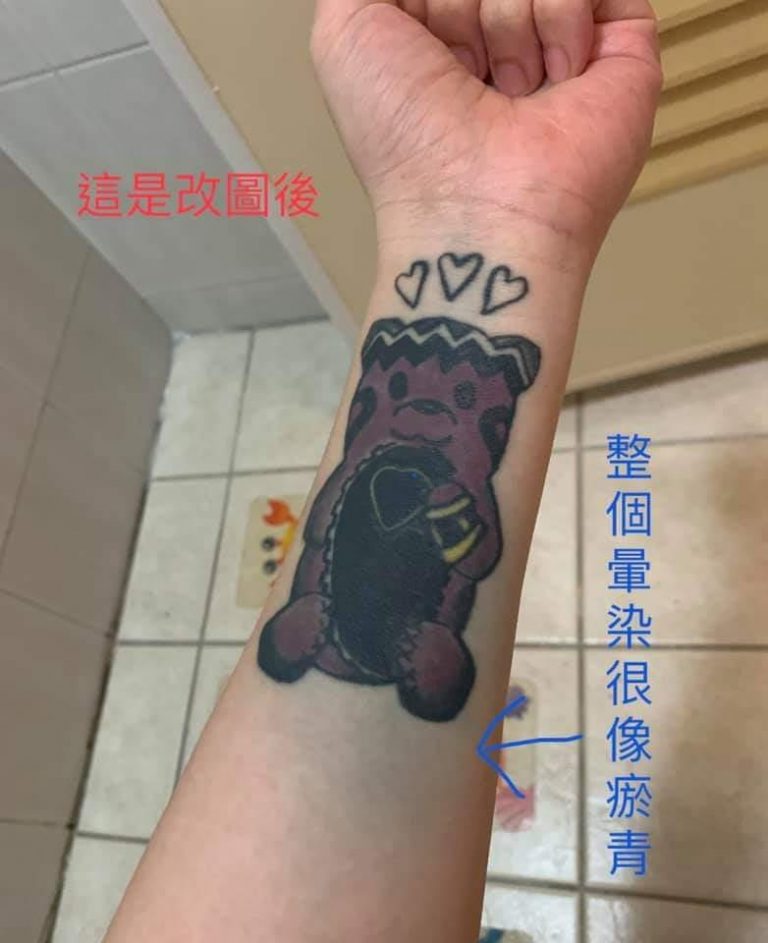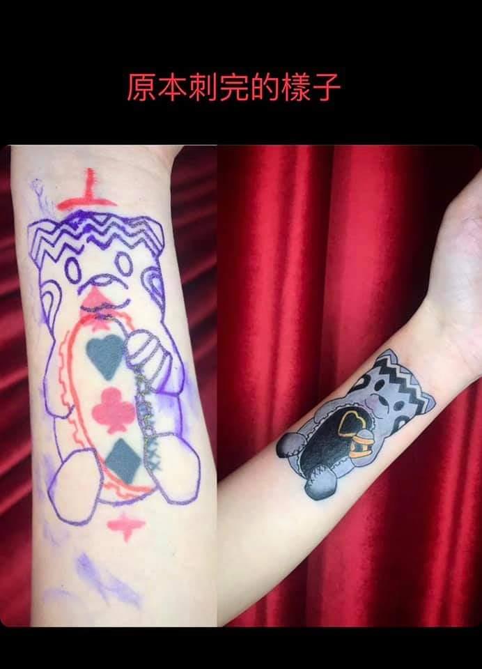 「那隻熊不論割線還是顏色都有問題,就像小朋友幫你刺 ,顏色沒蓋上還好,用激光把圖打淡一點還可以找個有技術的刺青師暴力蓋圖。但是你現在顏色那麼深,你一定要激光幾次才有辦法蓋,不然就是一團黑。」