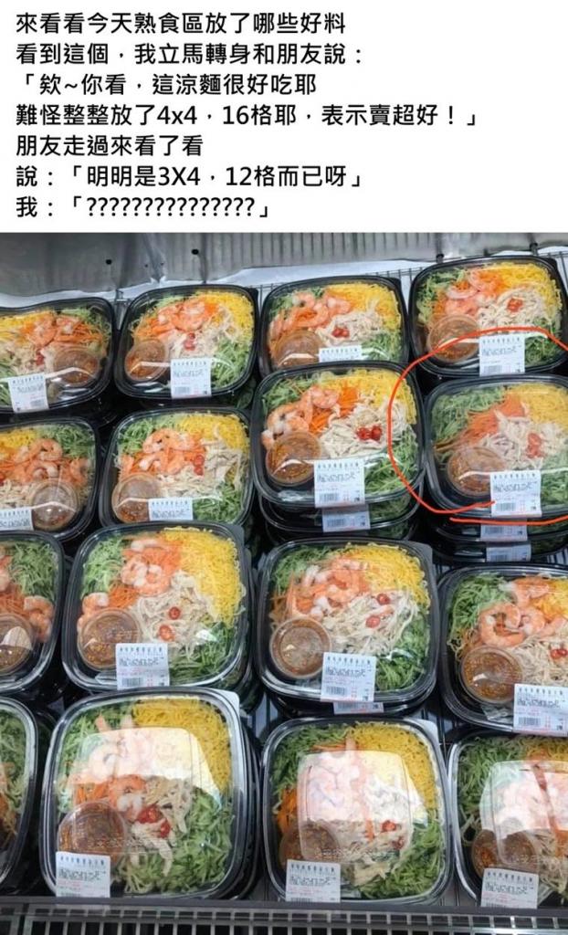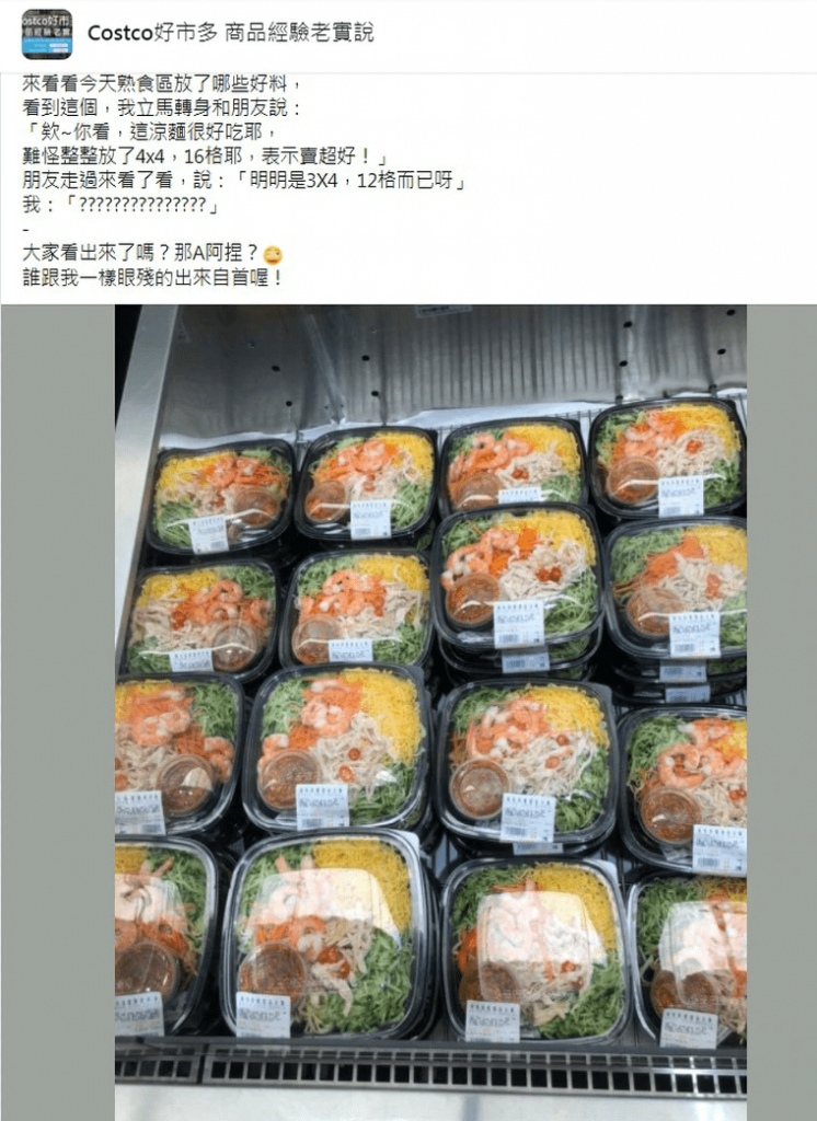 一名網友在臉書公開社團「Costco好市多 商品經驗老實說」貼出熟食區的涼麵照,她表示看到後很開心地向朋友說「欸~你看,這涼麵很好吃耶,難怪整整放了4×4,16格耶,表示賣超好!」不過她的朋友卻說「明明是3X4,12格而已呀!」