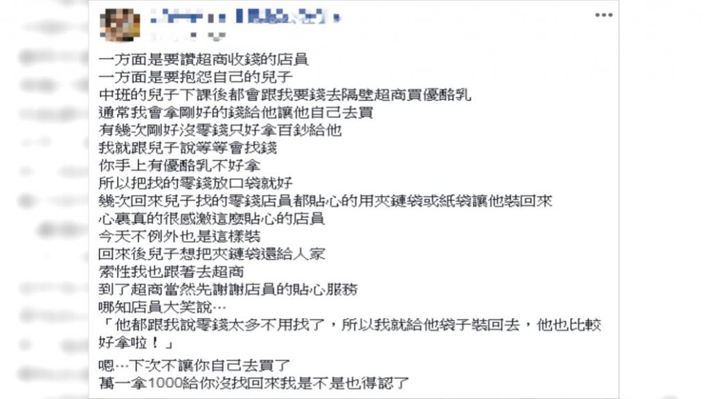 一位媽媽無奈分享自己的經驗,前幾天就讀幼 稚 園中班的兒子,從學校放學回家後,就一直吵著要到隔壁超商買優酪乳,由於超商就在隔壁,且也跟店員很熟,於是就掏了一百塊讓兒子自己去買來喝,出發前她還特別叮嚀兒子,找回來的零錢怕弄掉,「一定要記得放口袋哦」。