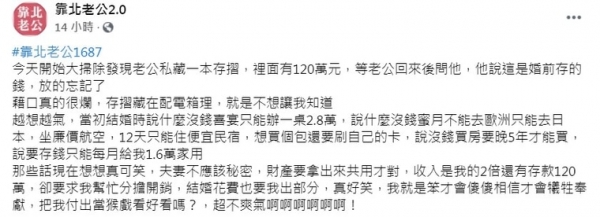 「完全可以明白你老公為什麼要藏存摺。他人生犯了兩個錯,第一個,娶了你。第二個,沒拿去買台積電翻倍存什麼銀行還被發現。」