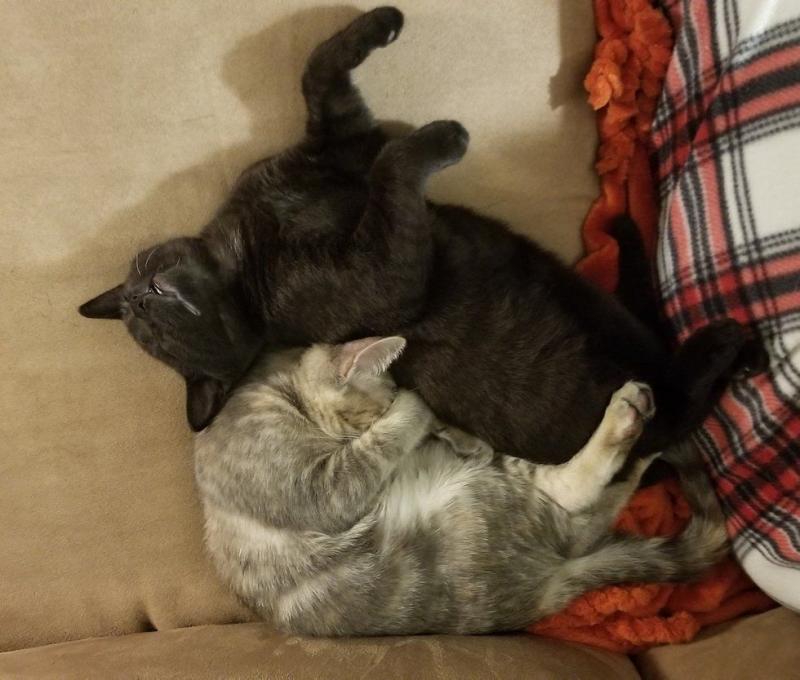 Munch比Betty大好幾個月,但牠們的體型差不多。Munch是一個很稱職的大哥哥,Betty絕育後休養期間,Munch專門跑去安慰牠,牠的抱抱給了Betty很大的安慰。