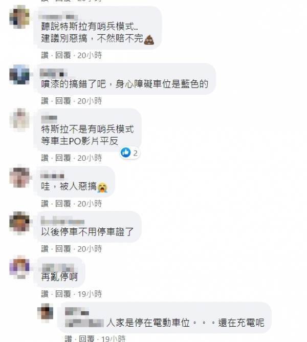 「身 障 車位是畫藍色線吧」、「囉,這誤會大了」、「噴漆的人GG囉,先跑路吧」、「這一賠,不知道要多少」、「烤漆費應該不少」、「噴漆的人弄巧成拙了,這是特斯拉專用充電車位」、「怎麼噴這麼特別的圖案」、「車主沒錯啊,綠色的確定是電能車位」、「太搞笑了,他是故意的還是真的看錯啊」。
