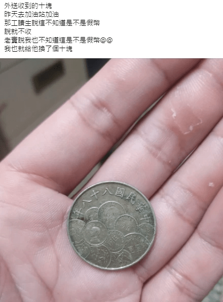 原PO在臉書社團「外送員的奇聞怪事」發文表示日前送餐時收到客人給的10元硬幣,看起來有些異狀,去加油站加油時,店家也以「不知道是不是假幣」為由拒收。