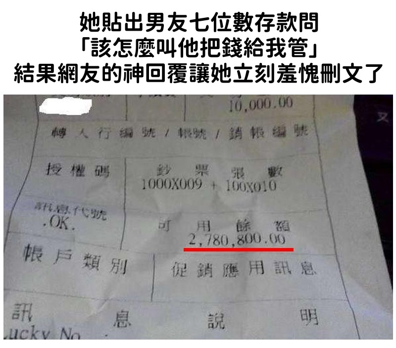 女網友翻出交往3個月男友的提款收據,得知上面的可用餘額高達278萬元。她拍下來PO在臉書上的不公開社團,詢問其他網友說:「沒想到他瞞著我偷存這麼多錢,該怎麼叫他把錢交給我管?」