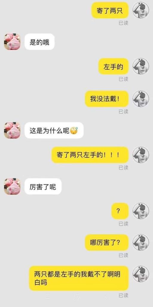 有點困惑的何先生以為客服小妹沒看清楚,所以再次表示「你們寄了兩隻左手手套!這樣我沒辦法戴!」